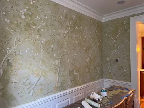 Using thin brick and lime plaster, the walls of Congressional Seafood/Nafco”s office were aged to give the old warehouse converted to office feel. Murals were painted throughout including a 15’x75’ fish mural in the form of the US flag.